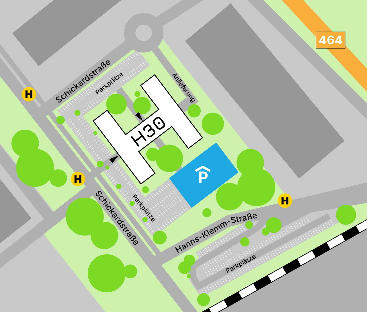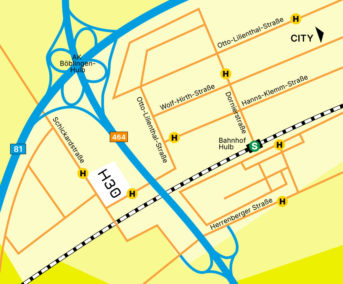 Viele Wege führen direkt ins H30. Mit dem Auto ist es dank nahegelegenem Autobahnkreuz Böblingen-Hulb besonders augenfällig. Von hier ist es nur ein Katzensprung nach Stuttgart. Flughafen, Messe und City liegen auf einem Weg. Und mit Bus oder Leihscooter ist man in innerhalb von 5 Minuten am nächsten S-Bahnhof. Mit reichlich Ladestationen für E-Bikes und Autos gehört die E-Mobilität einfach schon dazu.